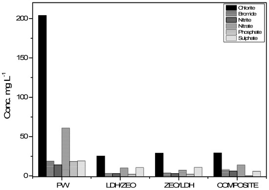 The initial concentrations of chloride, bromide, nitrite, nitrate, phosphate and sulphate without the presence or action of adsorbents were 203.971 mg L−1, 18.656 mg L−1, 13.97 mg L−1, 60.757 mg L−1, 18.304 mg L−1 and 19.027 mg L−1. The removal rates obtained by the composite treatment were 85.7%, 57%, 56%, 77.4%, 99.7% and 70.1% for the chloride, bromide, nitrite, nitrate, phosphate and sulphate ions, respectively.