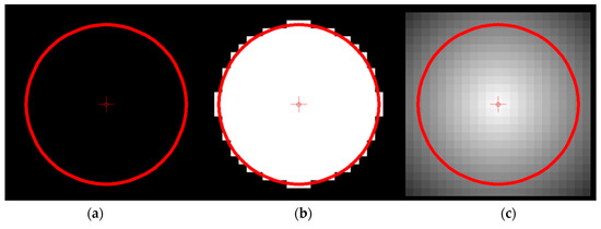 Figure 1. The approximation of a given circular contour (a) in a binary voxel model (b) allows only an inaccurate description. The use of signed distance fields (c) and the interpolation-based recalculation of the contour is much more accurate.