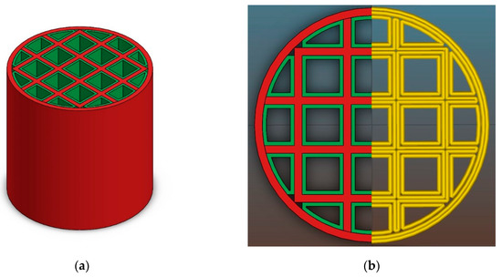 Figure 8 shows the CAD model of a honeycomb consisting of two different parts. Each part will be printed with a different suspension to achieve dense (red) and porous (green) volumes. The CAD data were designed by means of SolidWorks. To generate the machine data the model was transformed into a g-code using the Slic3r software (version 1.2.9) as shown in Figure 8b.