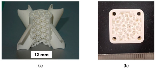 The prepared CAD model of the structure was converted into a compatible format for stereo lithography (*.stl). A perforated cylinder with a wall thickness of 1.1 mm, surrounded by tapered struts with a minimal diameter of 0.3 mm, was designed. In Figure 12 the polymeric template, additively manufactured using the Lithoz device, is depicted.