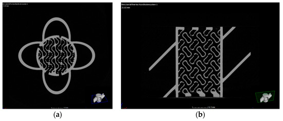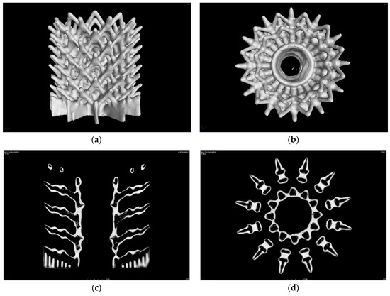Figure 14. CT analysis of the sintered silicon carbide (SSiC) structure (outer diameter approximately 25 mm): side view (a), top view (b), vertical cut (c), and horizontal cut (d).