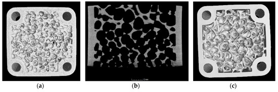Figure 11. CT scan images of the sintered alumina component (18 × 18 × 10 mm³) with graded porosity: bottom (a), top (c), and cross-section image recalculated from the CT scan (b).