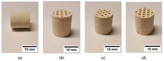 Figure 15. Green honeycombs additively manufactured with different suspensions: (a) C&G, (b) C&G, (c) C&G, and (d) A&F.