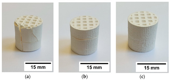Figure 16. Sintered honeycombs manufactured with different suspensions: (a) A&F, (b) C&G, and (c) C&G.