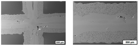In case of the SiC suspension, a homogeneous coating of all struts was found while all the defined pores between the strut network remained perfectly open. During pyrolysis, the melting and outgassing template material induced small cracks at the base area, especially in the center ring holding the highest amount of template material. In contrast to this, all the other struts have survived the pyrolysis without any defects (Figure 13a). Despite shrinkage, no new cracks were observed in the structure after completed sintering (Figure 13b).
