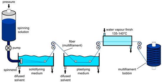 Polyacrylonitrile (PAN) fibers and both types of polyacrylonitrile-polyaniline fibers (PAN/PANI) were obtained using the wet method. A reference fiber spinning solution (PAN) was prepared by dissolving polyacrylonitrile (13.5%) in dimethylformamide (DMF) at 40 °C. After passing through the nozzle, the spinning solution was introduced into a solidifying bath, in which PAN coagulated in the form of fibers (Figure 2). In a solidifying bath (60% aqueous DMF solution) at 20 °C, and in a plasticizing bath (50% aqueous solution of DMF) at a temperature of 70 °C, intensive removal of the solvent and impurities from the formed fibers took place. The fibers underwent a two-stage stretching process—in the plasticizing bath and in water vapor at 135 °C. During these processes, the orientation of macromolecules took place and the fiber structure was ordered, which improved the mechanical properties of the fibers. The PAN/PANI in situ fibers were not subjected to stretching in water vapor because of tearing during the tensile test. The formed and stretched fibers were wound on reels.