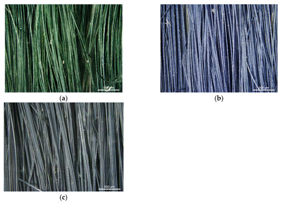 Fiber images made with an optical microscope. Fibers obtained as a result of the addition of polyaniline (PANI): (a) after rinsing in water; (b) after rinsing in HCl; and (c) fibers obtained as a result of in situ synthesis of PANI.