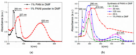 UV-Vis spectrum: (a) polyacrylonitrile (PAN) and PANI powder dissolved in Dimethylformamide (DMF) (blended); (b) change in absorbance during the PANI synthesis in DMF (in situ).
