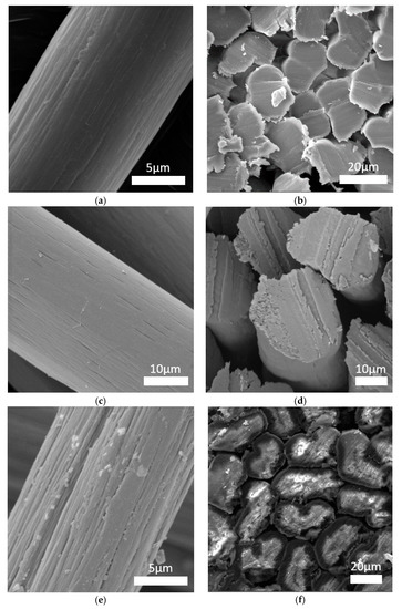 The microstructure of the fibers was observed using a scanning electron microscope (Figure 6). Cross-sections of individual fibers were also made using a focus ion beam (FIB) microscope (Figure 7). The surface morphology and fiber cross-sections were different for every fiber. The standard PAN fibers had a visible fibrous structure with characteristic furrows on their surface (Figure 6a). The cross-sections of these fibers had a characteristic bean-like shape (Figure 6b). The surface of the PAN/PANI blended fibers treated with hydrochloric acid was very smooth, and their cross-section was oval (Figure 6c,d and Figure 7b). Deep furrows were clearly visible on the surface of the PAN/PANI in situ fibers. The cross-sections of these fibers showed pores and cracks (Figure 7c). The cross-section shape was also bean-like, but the surface structure was clearly different from the inside of the fibers (Figure 6e,f). The structure of the PAN/PANI in situ fibers was discontinuous and contained many defects. It was clearly more heterogeneous than in the PAN/PANI blended fibers (Figure 6e,f).