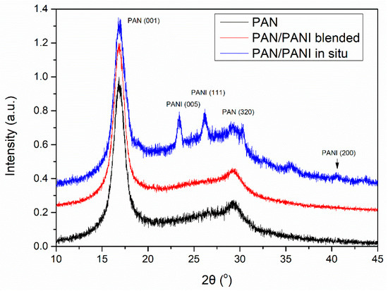 The fiber crystal structure was determined based on XRD studies (Figure 8). On all diffractograms, peaks characteristic of polyacrylonitrile were visible. Particularly clear was the peak at 2θ~18°, which was characteristic of the hexagonal structure of PAN. In the PAN/PANI blended fiber spectrum there were no peaks characteristic of PANI, most probably due to its small amount in the fibers. However, they were clearly visible in the PAN/PANI in situ fibers, and corresponded to the pseudo-orthorhombic phase of PANI [28].