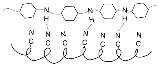 However, in the material containing both of these polymers, the crystallization process was difficult due to the interactions between nitrile (PAN) and amine (PANI) groups (Figure 10). In addition, numerous cracks and voids appeared in the structure of the fiber (Figure 6c). Analysis of the literature data [32] indicated that the nitrile group, in some cases, may have interfered with or acted as a barrier when ordering polymer chains. This can take place in the PAN/PANI in situ fibers, where the strong interaction between the polymer chains blocks their movement, thereby limiting the crystallization process.