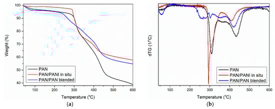 Further fiber degradation was associated primarily with the phenomenon of polyacrylonitrile cyclization occurring under nitrogen [37]. Analysis of the first derivative of TG curve (i.e., DTG curve) showed that in the case of the pure PAN and PAN/PANI blended samples, the degradation can be described as one-step and starts at around 280 °C. The PAN/PANI blended fiber was characterized by a very rapid decomposition in this temperature range, which persisted up to 350 °C.