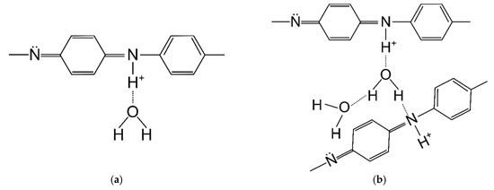 The first mass loss was caused by the loss of water bound in the material, which was due to polyaniline adsorbing large amounts of water. Water can be associated with polyaniline macromolecules in two ways: strong and weak. Poorly bound water molecules are connected to the PANI chain with one hydrogen bond (Figure 12a). In contrast, strongly bound water is connected by two hydrogen bonds (Figure 12b), most often between two adjacent PANI chains [25].