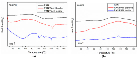 In the case of the PAN/PANI in situ fibers’ heating curve, a wide endothermic peak was seen with a maximum at 50 °C, associated with the removal of poorly bound water. An endothermic peak was seen at 102 °C, associated with the desorption of strongly bound water to the PANI [38]. Subsequently, the glass transition in the PAN was observed at about 110 °C, but its exact value was difficult to accurately determine because of the overlap of both processes. At 140 °C, one more endothermic peak was visible, which may be the result of the presence of low molecular weight fractions in the material remaining after the PANI polymerization process (Figure 13a). In the cooling curve, two exothermic peaks were observed, which could be connected with crystallization of previous melted low molecular fractions during heating. Also, a glass transition of PAN at about 100 °C was present (Figure 13b). The obtained results indicated a large heterogeneity of the system, which was also confirmed by previous SEM, mechanical strength, and TG measurements.
