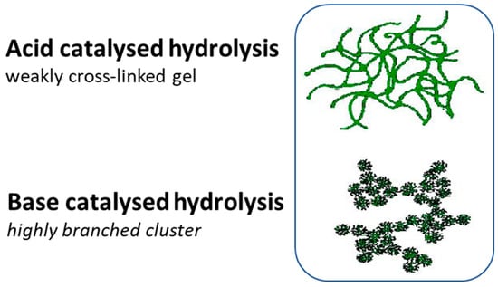 Its structure is strongly dependent on the water content in the system and on the catalysis nature. Generally, the silicon dioxide that was obtained starting from acidic “sol” has a network consisting of linear polymers with a low density of crossed bonds; from basic solutions, instead, highly branched clusters are obtained, as in Figure 2. This is the result of the competitive effect of the hydrolysis and condensation reactions whose rates are pH dependent. The reactivity of the silicon alkoxides, Si(OR)4, can be also governed by the choice of the alkoxy groups, since the condensation and hydrolysis rates are determined by steric hindrance factors [31,32,33].