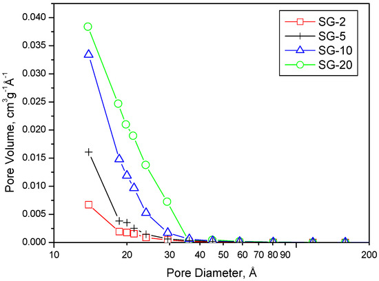 N2 adsorption-desorption isotherms of SG-R samples has a type I isotherm (not reported), reaching saturation at low P/P0 values, and without hysteresis loop, as typical of a microporous material. The N2 volume adsorbed becomes higher while increasing Rw, together with smoother isotherm knee indicating the presence of a wide range of pores diameters. The corresponding values of specific surface areas (SSA), total pore volume (Vp), and micropore volume (VMP) are reported in Table 1. Pore Size Distributions (PSD) that were obtained by applying Barrett–Joyner–Halenda (BJH) approach to desorption branches of the corresponding isotherms, are reported in Figure 4: in agreement with isotherms shape, the pore volume, and the average pore size increase from SG-2 to SG-20.