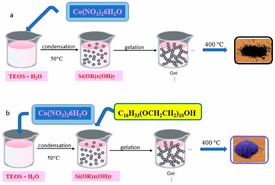 - Santos, G.A.; Santos, C.M.B.; da Silva, S.W.; Urquieta-González, E.A.; Confessori Sartoratto, P.P. Sol-gel synthesis of silica–cobalt composites by employing Co3O4 colloidal dispersions. Colloids Surf. A 2012, 395, 217–224. [Google Scholar] [CrossRef]