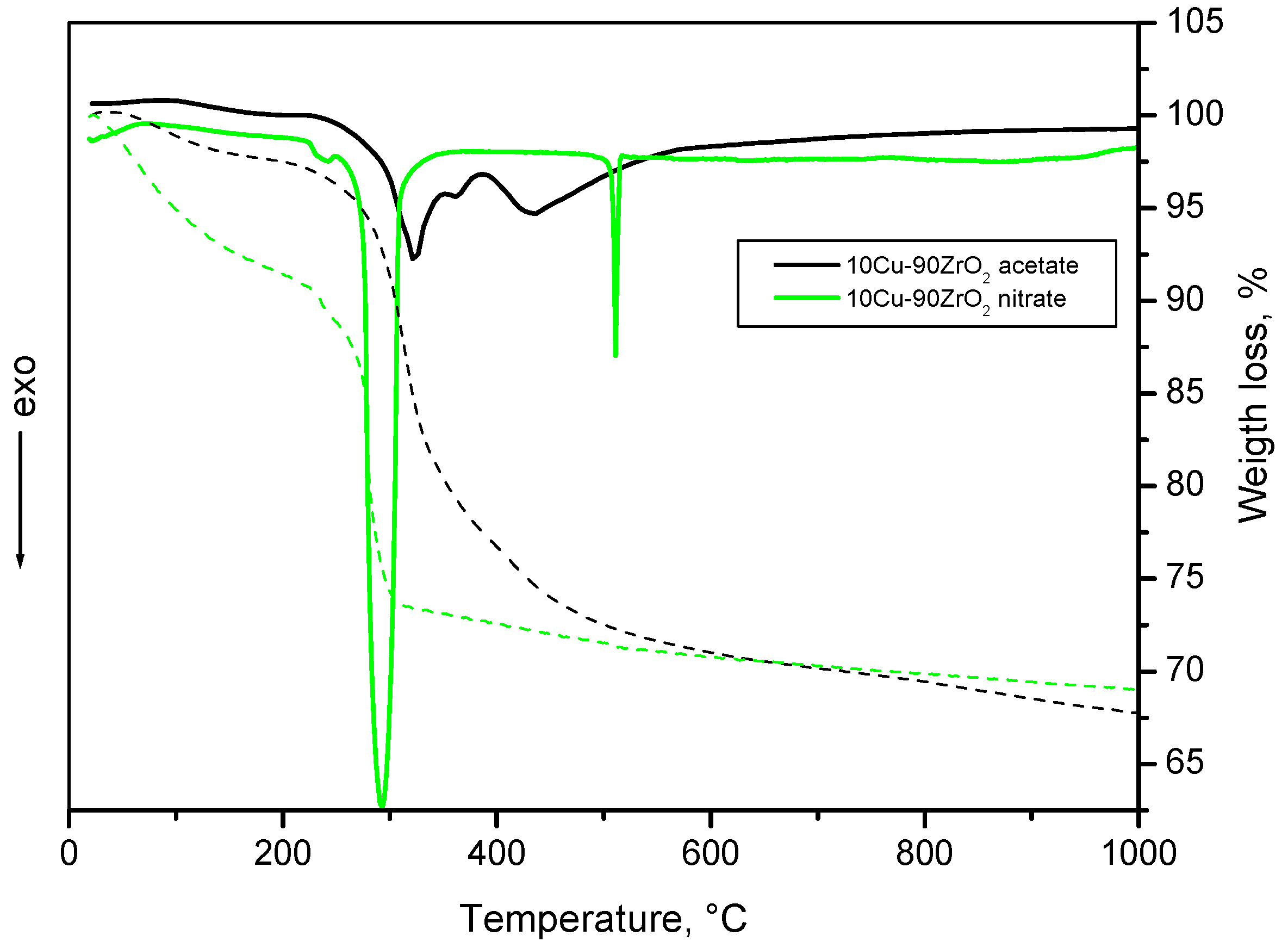 - Esposito, S.; Turco, M.; Bagnasco, G.; Cammarano, C.; Pernice, P. New insight into the preparation of copper/zirconia catalysts by sol-gel method. Appl. Catal. A Gen. 2011, 403, 128–135. [Google Scholar] [CrossRef]