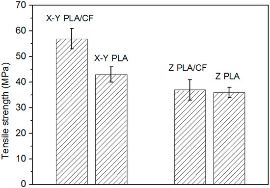 The tensile strength of the sample is shown in Figure 3. The tensile strength of PLA without carbon fibers differs only slightly (10%–20%) between the X–Y PLA and Z–PLA. The reason for this is that the bonding strength between layers is weaker than the strength of the PLA body, and the solvent blurs the interface between layers. This results in lower anisotropy than is commonly observed in 3D printing. For example, the difference in tensile strength in different directions of FDM (Fused Deposition Modeling) printing is generally more than 50% [27]. When carbon fibers were added to the PLA, the tensile strength in the X–Y plane was about 50% higher than that in the Z–plane. In addition, the carbon fibers change the tensile properties of the specimen. In the X–Y plane, the addition of carbon fibers increases the tensile strength by about 40%, whereas the strength in the Z–direction hardly changes. Moreover, the test standard deviation of the samples with carbon fibers is larger than that of pure PLA. This is mainly because of insufficiently uniform dispersion of fibers and their effect on the interfacial bond strength between layers.