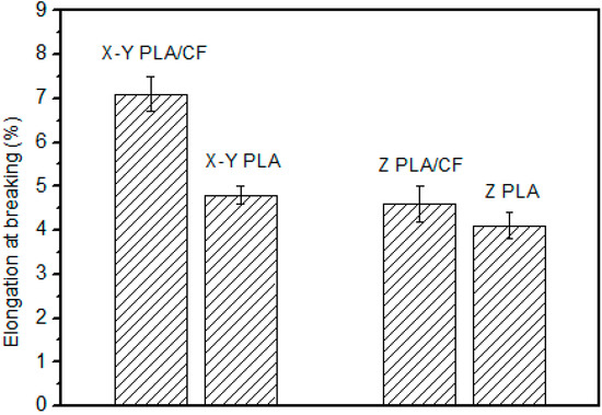 Figure 4 shows the elongation upon breaking of the specimen. The trend among specimens is similar to that for the tensile strength. The elongation at breaking of PLA without carbon fibers is 20% larger in the X–Y plane than in the Z–plane, which is mainly because of the weak bonding force between layers. By contrast, in the presence of carbon fibers, there is a large difference in elongation between the two directions.