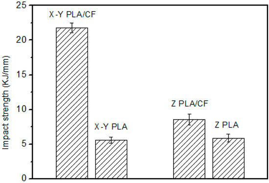 The impact strength of the different specimens is shown in Figure 5. The general trend among specimens is similar to that of the tensile strength, but much more pronounced. The impact strength was 300% higher in the X–Y plane with carbon fibers than in the Z–plane without carbon fibers. This is because the carbon fibers confer impact resistance of PLA and the effect of fiber orientation. The impact strength in the X–Y plane with carbon fibers is about 140% higher than that in the Z–plane of the specimens with carbon fibers. This is because of the fiber orientation in the specimens. The impact strength in the Z–plane of specimens with carbon fibers is about 50% higher than that without carbon fibers; the impact strength of specimens without carbon fibers differs only slightly between the two directions.