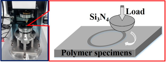The friction and wear tests of PLA composites sliding against an Si3N4 ball were evaluated on a ball-on-disk tribo-meter (HSR-2M, Zhongke Kaihua Technology Development Co., Lanzhou, China) at room temperature. The contact schematic diagram of the friction couple was shown in Figure 6. The Si3N4 ball, as a counterpart, was 4 mm in diameter. Before each test, the Si3N4 ball and the block samples were cleaned with cotton dipped in acetone. The friction coefficient was continuously recorded by an online data acquisition system attached to the tester.
