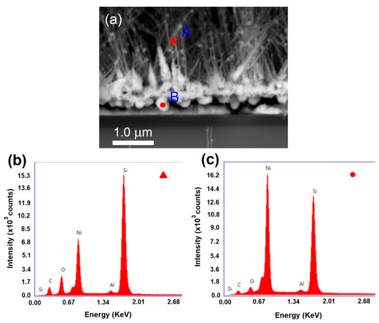 Figure 3a depicts the FESEM cross-section image for the elemental analysis of EDX point scan on the stem of nanowires (A) and the NiSi solid particles under the deposited layer (B). The EDX spectra for the scans at A and B are shown in Figure 3b,c, respectively. Obviously, the point A shows relatively higher contents of C, O, and Si than point B except the Ni content which is in contrast and higher in point B. The elemental contents of the points A and B are tabulated in Table 1. Quantitatively, the stem of the nanowires consists of C (25.45%), O (13.72%), Ni (11.70%), and Si (48.03%) indicating typical elemental content of NiSi/SiC core-shell nanowire compositions. The presence of O content is likely inferred to the formation of thin amorphous SiOx on the nanowires due to the oxidation when the nanowires were exposed to the atmospheric ambient [29]. It is worth noting that the NiSi solid particle compositions were dominated by Ni (29.19%) and Si (45.14%) comparatively with C (17.02%) and O (7.46%). The presence of C and O are likely because of the deposition of SiC layer and oxide residuals or oxidation, respectively. The EDX results reveal that the NiSi alloy particles act as solid seeds for the spontaneous growth of NiSi core nanowires followed by the nucleation limited silicide reaction as modelled by Kim et. al. [30]. The successive spontaneous diffusion of Ni into the NiSi particles leads to the growth of NiSi nanowires once it reached to the degree of supersaturation. Further, the out-diffusion of Ni into the deposited Si layer increased the size of the NiSi particles. However, the radial deposition of SiC on the particles limited the further growth of the NiSi particles [31]. This significantly increases the volume free energy and consequently reduces the surface free energy leading to the growth of axial NiSi core nanowires. The radial deposition of SiC on the NiSi particles mediates as SiC shells is followed by the axial growth of NiSi core nanowires.