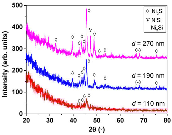 XRD patterns of the NiSi/SiC core-shell nanowires grown by HWCVD at different Ni thicknesses of 110, 190, and 270 nm. The legend indicates the phases of the NiSi chemical formula.