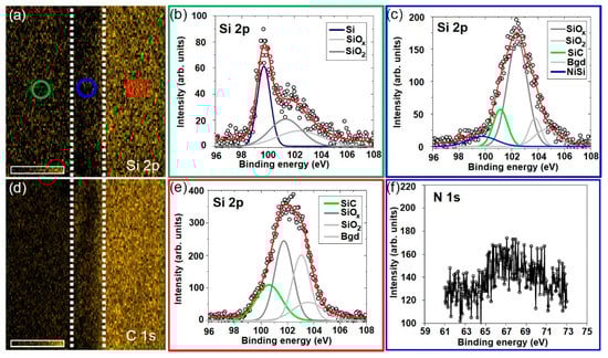 (a,d) XPS map images of Si 2p and C 1s of NiSi/SiC core-shell nanowires grown by HWCVD, respectively. The Si 2p signal was collected by a higher binding energy detector. The brightness of the map images is relatively corresponding to the intensity of the XPS signals (Si 2p and C 1s). The pixel size is approximately 2 × 2 µm2. (b,c,e) The respective XPS narrow-scans of Si 2p at the position in (a) indicated by the empty circle with different colors. (f) The respective XPS narrow-scan of Ni 3p at the position in (a) as indicated by the blue color of the empty circle.