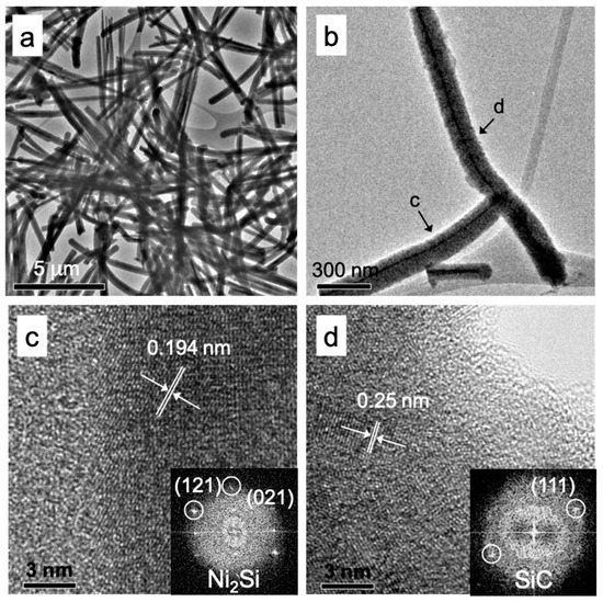 The microstructure of a typical single NiSi/SiC core-shell nanowire was investigated by TEM and HRTEM images as shown in Figure 7. The typical pile of nanowires in TEM image is illustrated in Figure 7a. The inner structure of the nanowires is clearly revealed in the image. Overall, no noticeable catalyst droplets could be seen on the tip of the nanowires in the image suggesting that the conventional VLS growth mechanism for 1D nanostructures can be simply neglected for these core-shell nanowires [34]. A branched nanowire in TEM image clearly depicts a core-shell structure of a single nanowire as shown in Figure 7b. The core and shell were consistently along the length of the nanowire. The average core diameter and shell thickness were measured about 11 ± 2 and 59 ± 10 nm, respectively. Furthermore, this branched nanowire is apparently grown at the stem of the nanowire resulting from the out-diffusion of the NiSi core and the beginning of the out-diffusion is clearly shown in Figure 7b. Figure 7c depicts a HRTEM image scanned near to the sidewall of the nanowire showing a single crystalline core and an amorphous shell of the nanowire. The estimated lattice spacing is approximately 0.194 nm, corresponding to Ni2Si (121) crystallographic plane (JCPDS card no. 065-1507). This suggests that the core nanowires were deposited along the [121] growth direction. The single crystalline of the Ni2Si core nanowire was further revealed by a fast Fourier transform (FFT) image as shown in the inset of Figure 7b. The amorphous structure of the shell nanowire is depicted by the HRTEM image collected at the sidewall as shown in Figure 7d. The shell nanowire clearly presents that the amorphous structure consisting of nano-crystallites embedded with its amorphous matrix. These nano-crystallites form as elongated crystallites contributing to the columnar structures as observed in the previous reports [25,35]. The estimated lattice spacing is approximately 0.25 nm corresponding to 3C-SiC (111) crystallographic plane (JCPDS card no. 002-1050). The measured crystallite size is approximately 6.1 ± 0.2 nm. These 3C-SiC nano-crystallites were grown radially toward the nanowire sidewall in [111] growth direction. The crystalline plane of the 3C-SiC (111) was further revealed by a FFT image as shown in the inset of Figure 7d.