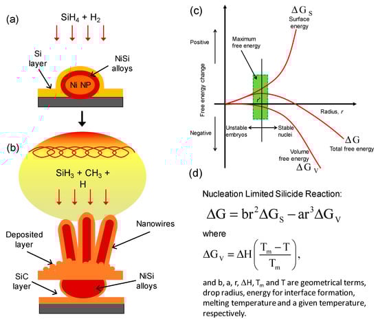 (a,b) Growth mechanisms of the NiSi nanoparticle and NiSi/SiC core-shell nanowires grown by HWCVD, respectively. (c) Free energy changes as function of drop radius for NiSi reactions. The shadowed region is proposed as a region for the growth of NiSi core nanowires. (d) The nucleation limited silicide reaction relation for the growth of the core nanowires.