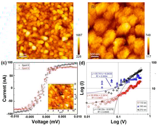 Figure 9a,b shows the AFM images of the NiSi/SiC core-shell nanowires at different scan sizes. The cluster of the nanowires is clearly observed and their vertical bundle is attributed to their nucleation limited silicide grown reaction. The details of the nanowire growth are obviously shown in Figure 9b. The clustering of nanowires can be observed in the image with the estimated average cluster size of approximately 29 ± 8 nm. The obtained average cluster size is closely consistent with the average diameter of the bundle nanowires measured by the FESEM image as shown in Figure 1c. Figure 9c demonstrates the current–voltage (I–V) curves of the clustered nanowires by a conducting AFM measurement. The selected clusters were identified by the open circle and square box as shown in the inset of Figure 9c. These I–V curves demonstrate a linear behavior at low voltage region. However, the curves turn to rectifying current voltage behavior for the applied voltages above 0.005 mV. The linear I–V characteristic is due to the metallic electrical property of NiSi and the Schottky curve could be attributed to the heterostructure of core-shell nanowire. By fitting the linear region of the I–V curves, the estimated conductivity of the bundle nanowires for the spots 8 and 9 are approximately 1.57 × 103 and 1.44 × 103 Ω−1 cm−1, respectively, with the scanned area of 0.403 m2. Figure 9d demonstrates the I–V curves of the NiSi/SiC core-shell nanowires grown at different Ni film thicknesses of 110, 190, and 270 nm, by the conducting AFM measurements. The linear regions of the I–V curves were fitted in a log scale for obtaining the ohmic contact characteristic of the nanowires and the bottom layer. The estimated conductivities of the single nanowire prepared at Ni film thicknesses of 110, 190, and 270 nm were approximately 4.11 × 102, 1.57 × 102, and 1.36 × 102 Ω−1 cm−1, respectively which is an order lower compared to that of bundle nanowires owing to the smaller surface area of single nanowire. However, these conductivities of the NiSi/SiC core-shell nanowires are relatively higher than the literature data (102 Ω−1 cm−1) and suggests that the formation of SiC shell layer on the nanowires could probably improve the electrical performance of the nanowires-based devices for harsh environment applications such as field effect transistors, field emitters, space sensors, and electrochemical devices [10,22].