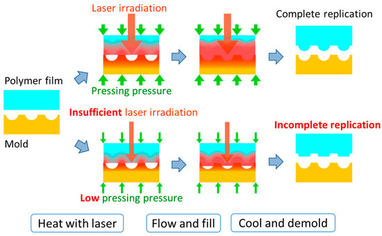 However, although it has already been demonstrated that various nanostructures could be replicated on polymer films using laser-assisted thermal imprinting (LATI), this has only been achieved in a few instances. When microstructures are replicated on a polymer film using LATI, the polymer cannot effectively fill the microstructures of the mold, and the microstructures can therefore not be completely replicated. This is because it takes a finite amount of time for the polymer to flow and fill the microstructures of the mold. The flow of the polymer is caused by the applied pressure generated by pressing the mold onto the polymer film and the decrease in viscosity of the polymer is caused by laser heating. Therefore, the pressing pressure and laser-irradiation time both have an important effect on the filling ratio of the polymer (Figure 1).