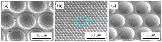 Figure 2. Scanning electron microscope (SEM) images of the microlens arrays (MLAs) in the Ni concave molds all shown as 30°-tilted views. (a) 33-μm-pitch MLA, (b) 5-μm-pitch MLA, and (c) magnified view of 5-μm-pitch MLA.