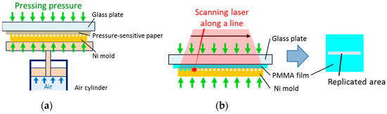Figure 3. Schematics of (a) measurement of the pressing pressure and (b) replication by scanning the laser along a line.