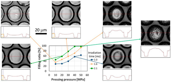 Figure 4 shows the relationship between the filling ratio and the pressing pressure for each laser-irradiation time in the replication of the 33-μm-pitch MLA. In addition, Figure 4 shows laser microscopic images taken at pressing pressures of 10, 30, and 50 MPa for the laser-irradiation time of 1.6 ms, an image taken at a pressing pressure of 40 MPa and laser-irradiation time of 1.0 ms, and an image taken at a pressing pressure of 20 MPa and laser-irradiation time of 2.1 ms. The filling ratio increased with increasing pressing pressure and laser-irradiation time. This tendency showed that the higher the pressing pressure, the faster the PMMA flowed and filled the mold. When the pressing pressure was increased, the thermal contact resistance between the PMMA film and the Ni mold decreased. The temperature of the PMMA then increased because of the increase in heat input, and the viscosity of the PMMA decreased. This decrease in the viscosity allowed the PMMA to flow more easily. At a pressing pressure of 50 MPa, although the filling ratio was approximately 100% for the laser-irradiation times of 1.6 and 2.1 ms, it was only approximately 60% for the laser-irradiation time of 1.0 ms. This was due to the laser irradiation being insufficient for the laser-irradiation time of 1.0 ms. When the laser irradiation was insufficient, the depth of the PMMA experiencing a temperature exceeding Tg was smaller than the lens depth of the 33-μm-pitch MLA. The filling ratio was almost identical when the pressing pressure and laser-irradiation time were 40 MPa and 1.0 ms, 30 MPa and 1.6 ms, and 20 MPa and 2.1 ms, respectively. In the laser microscopy images obtained under these conditions, the height difference between the highest area and the center of the replicated microlens decreased with increasing laser-irradiation time. This tendency showed that the temperature of the PMMA exceeded Tg not only in the mold contact area but also in the noncontact area when sufficient laser irradiation was provided, causing the PMMA to flow in both the contact area and the noncontact area. On the other hand, when the laser irradiation was insufficient, the temperature of the PMMA only exceeded Tg in the contact area and the PMMA flowed only in the contact area. As can be seen in the result associated with an irradiation time of 2.1 ms and pressing pressure of 50 MPa, the filling was almost perfect. The LATI process possibly did not reach 100% filling because of shrinkage due to rapid cooling after the laser irradiation. However, the filling was successful using the various pressing pressures applied in this study.
