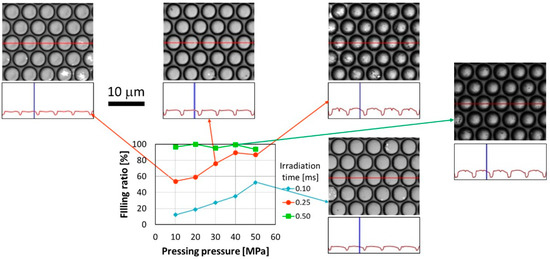 Figure 4. Filling ratio as a function of pressing pressure for each irradiation time in the replication of the 33-μm-pitch MLA.