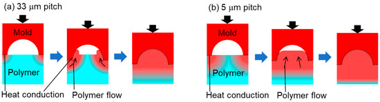 This section discusses the differences in the shape of the polymer surfaces after undergoing the LATI process. As shown in Section 3.1 and Section 3.2, the leading surface of the polymer in the cavity of the 33- and 5-μm-pitch MLAs showed double and single peaks in the cross-section view after imprinting, respectively. Figure 6 shows the schematic of the heat conduction and polymer flow for the 33- and 5-μm-pitch MLAs. In the larger cavity, the depth of the heated area was smaller than the scale of the cavity and the polymer near the contact surface preferentially decreased in viscosity and a resultant double peak was formed, as shown in Figure 6a. In the smaller cavity, the depth of the heated area was comparable to, or larger than, the scale of the cavity and all the polymer around the contact surface was heated and the resultant polymer flow caused a single peak as shown in Figure 6b. To more comprehensively analyze the polymer flow phenomena seen in Figure 6a,b, experiments should be conducted using MLA with other sizes ranging from between 33 and 5 μm pitch. Applying simulations that incorporate the modelling of viscoelastic body behavior [22,23,24] to the MLA imprinting process would also be useful. Furthermore, other parameters such as laser power, spot diameter, and offset temperature are important and further investigation of these parameters would expand the discussion.