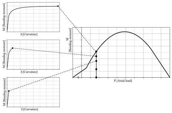 The construction of the P-M domain was carried out starting from the bending moment versus curvature diagrams, identifying the maximum values of bending moments at different axial loads (Figure 3). In a generic P-M domain, once the axial load is fixed, the points along a vertical line represent different steps at increasing curvature in the plane M-χ. In the P-M domain is reported the bending capacity for a given axial load, as the end point of the M-χ diagram, or the maximum value in general of the bending moment versus curvature diagrams.