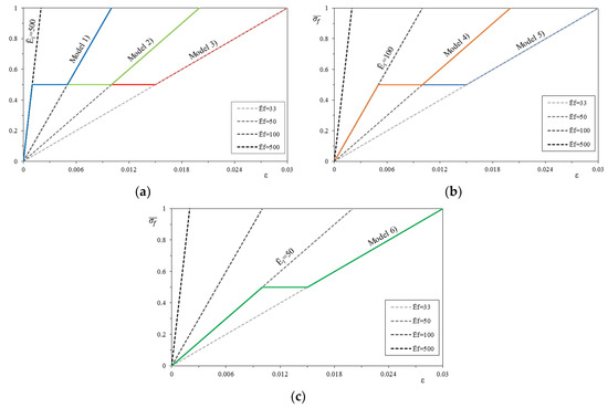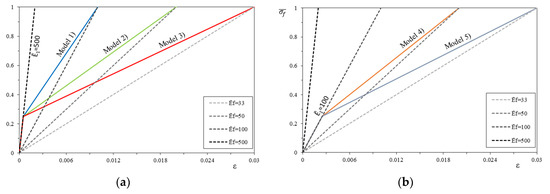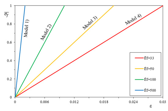 The choice of the mechanical and geometrical parameters for the sensitivity analysis was carried out by analyzing a large amount of dry fibers and commercially available structural mortars in order to identify the typical mechanical characteristics and ranges. Please note that for FRCM there is the inorganic matrix, while for the FRP there is only dry fiber properties, and the matrix is neglected (i.e., only linear behavior). Then, in Table 1, the ranges of the geometrical and mechanical parameters are reported with regard to the composite systems and masonry. From the combination of the different extreme values of the intervals, a possible range of variability of the composite systems has been identified (the different stress–strain relationships have been called models). The normalized stiffness of the dry fiber ranged from = 33 up to = 500, generating four linear diagrams ( = 33, = 50, = 100, and = 500), as shown in Figure 5.