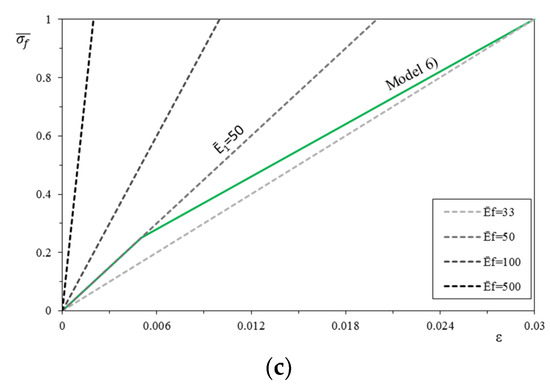 The trilinear behavior is modeled by means of three linear relationships. Compared to the bilinear, it accounts for an imperfect matrix contribution, after cracking, with a reduced tension stiffening effect (Figure 2). It is sometimes found in systems with natural fibers [49,50]. The first linear behavior is similar to the bilinear model, however, after cracking, there is a noticeable increase in deformation, caused by the development of the cracks without a clear increase of stress, and in particular the second stage is modeled as a perfectly horizontal (zero stiffness) plateau in this study. Hence, the slope of the second line is zero and the transition strain, , before the third linear part is: