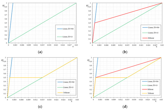 In the following, the stress–strain relationships of the composite system are simulated in three ways through three types of relationships: linear behavior, bilinear behavior, and trilinear behavior. The representativeness of the behavior depends on the characteristics of the system, as remarked in various experimental studies [42,43].