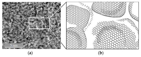 (a) Microstructure derived from transmission electron microscope (TEM)-measurement performed at Fraunhofer Institute for Microstructure of Materials and Systems (IMWS) with commercially available Glassy Carbon; (b) Model-based visualisation of microstructure according to Harris [18].