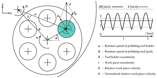 Both grinding and polishing were carried out on a Bühler Phoenix 4000 flat polishing machine (Bühler AG, Uzwil, Switzerland). The setup includes a rotation of the polishing pad (Ω) and an independent rotation of the workpiece holder (ω) (Figure 5). This kinematic enables different polishing paths, such as cycloid or hypocycloid.