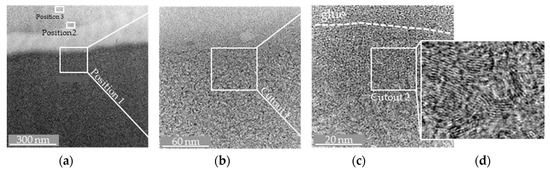 (a) Overview on the TEM-measurement area on the wedge-glued Glassy Carbon specimen; (b) Magnification at Position 1; (c,d) Further Magnification of the subsurface region and cut-out of the microstructure.