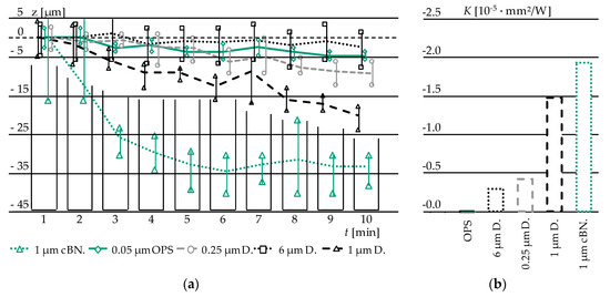 The results of the height reduction dz over a time increment of dt = 1 (polishing) min are displayed in Figure 8a. Based on the Preston hypothesis (1) and considerations of the relative velocity (2) and (3) the empirical constant K can be derived (Figure 8b).