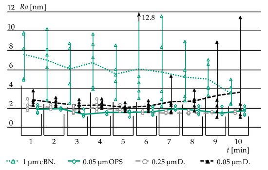- 0.05 µm diamond grain suspension (0.05 µm D.):A decrease in diamond grain size was suspected to lead to even lower roughnesses. The outcome could not prove this assumption. Instead, a significant “over polishing” effect was observed, that is, beginning from minute 7, the spread of the measurement data rose. Even by neglecting this circumstance, 0.05 µm D. did not achieve better results than 0.25 µm D.