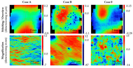 Of the pair of samples, that with the 0.25 μm diamond suspension and that processed by the company Aixtooling GmbH, show a globally homogeneous surface topology that is not disturbed by defects on the stitching images. A comparison of these surfaces is shown in Figure 10 (upper row), which compares the stitchings of the sample pairs of Case A, B and 0. The measurements serve exclusively to illustrate differences in the global characteristic surface topology. Since the sample pairs of Case A and Case 0 do not show any characteristic differences on the stitching images, the different procedure for the preparation of microstructural differences is to be assumed. However, this cannot be represented by the coarse measurement at 2.5-fold WLI magnification. The examination of the two sample pairs at higher magnification (objective with 10-fold WLI magnification) confirmed the assumption (Figure 10, lower row). The Case A samples machine-polished with 0.25 μm diamond suspension show a highly directional microsection structure characterised by superimposition of finest scratches. In contrast, the tools of Case 0 finished manually by Aixtooling have a rather granular isotropic surface.