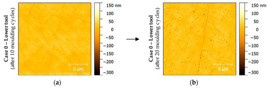 Atomic force microscope (AFM) measurements of Glassy Carbon mould tool surfaces of Case 0: (a) Lower tool after 10 moulding cycles; (b) Lower moulding tool after 20 moulding cycles.