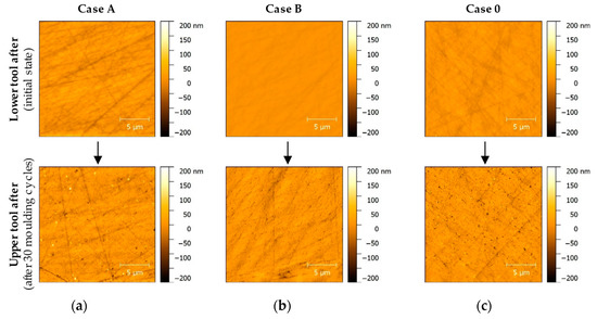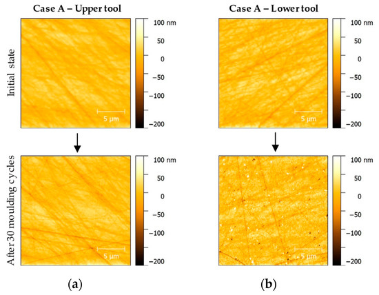 AFM inspection of moulding samples in initial state and after 30 moulding cycles: (a) Case A—Upper tool; (b) Case A—Lower tool.